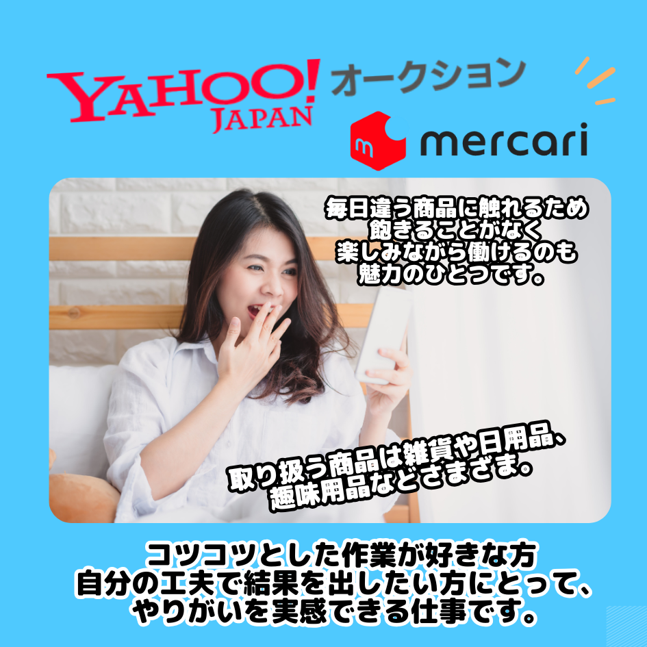 | 仕事内容 | 【急募】ヤフオク・メルカリへの出品&発送スタッフ!