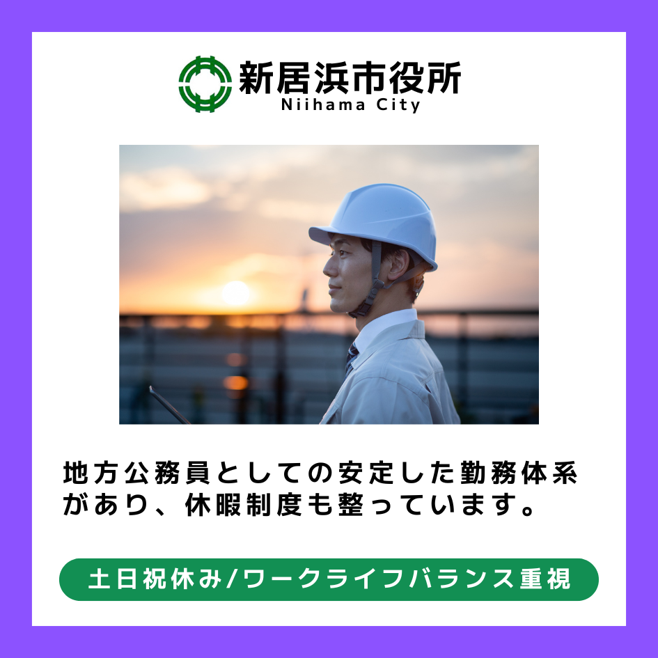 ・1977年4月2日~2004年4月1日までに生まれた方 ・地方公務員法で定められる欠格事項に当てはまらない方 〈例:拘禁以上の刑を受けている場合や、過去に懲戒免職を受けてから2年未満の場合など〉 ・新居浜市に住んでいる方、または採用後に市内へ移住できる方 \こんな方を歓迎します!/ ・地域に根ざして働きたい方 U・Iターンを考えている方も大歓迎!生活と仕事を両立できます。 ・市民の暮らしを支えるやりがいある仕事をしたい方 設計や施工管理の経験を、公共建築や住宅政策に活かせます。 ・チャレンジ精神があり、新しい発想で行動できる方 変化の時代に対応し、前向きに仕事を進められる方を求めています。 ・プロ意識と責任感を持ち、チームで協力できる方 行政職員としての使命感を持ち、誠実に業務を遂行できる方。 |