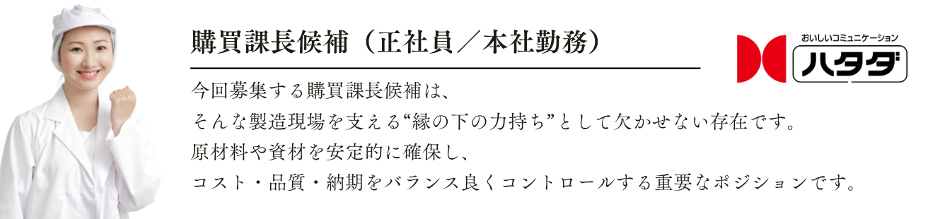 創業90年以上の老舗お菓子メーカー『ハタダ』の購買部門で、将来の課長候補としてご活躍いただきます。 「栗タルト」「どら一(いち)」など人気商品の製造を支えるために、原料や資材の安定調達とコスト管理を担う重要ポジションです。 【主な業務内容】 ① 原料・資材の仕入れ・発注 ・小麦粉、砂糖、乳製品、包装資材などの調達 ・数量・納期・品質を管理し、安定供給を実現 ・生産スケジュールに基づく発注計画の立案 ② 価格交渉・コスト管理 ・取引先との条件交渉(価格・納期・支払条件など) ・原材料高騰や市況変化に応じた見直し・調整 ③ 社内調整(開発・生産管理部門) ・新商品や仕様変更時の原料選定をサポート ・生産計画に合わせた仕入れ調整と在庫最適化 ④ 協力会社との関係構築(最重要ミッション) ・取引先との信頼関係を築き、長期的なパートナーシップを確立 ・定期的な連絡・訪問で安定的な供給体制を維持 【将来的な役割】 購買部門を統括する課長職として、チームマネジメント・仕入れ戦略立案・コストコントロールなどを担当。 製造・開発・営業など他部門との橋渡し役としても中心的に活躍いただきます。 【活かせる経験・スキル】 ・メーカーでの購買・生産管理・工場勤務の経験 ・仕入れ・価格交渉・サプライヤー管理スキル ・SAPシステムの使用経験(あれば尚可) ・Excel、Wordなどの基本操作スキル 【この仕事の魅力】 ・愛媛に根ざした安定企業で、転勤なし・社宅あり ・老舗ブランド『ハタダ』のものづくりを支えるやりがい ・購買の経験を活かし、幹部候補としてキャリアアップできる職場 |