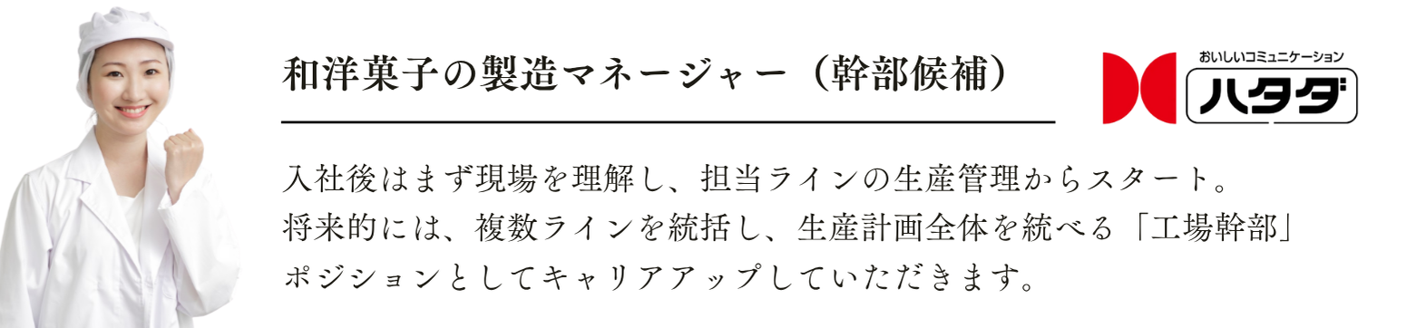 【年収500万円】製造ラインのマネージャー募集! 品質・コスト・納期の最前線でチームをリードし、生産現場の安定と成長を支えるポジションです。 これまでの生産管理経験を活かして、老舗お菓子メーカー『ハタダ』の“幹部候補”としてキャリアを築きませんか? 創業90年以上の歴史を持つ『ハタダ』は、四国銘菓「栗タルト」や人気の「どら一(いち)」など、幅広い世代に愛されるお菓子を手掛けています。地域の味を守りながら、新しい時代へと進化を続けています。