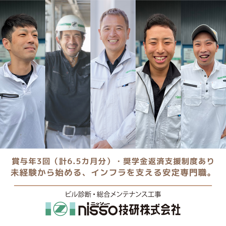 賞与計6.5カ月分(前年実績)未経験から社会インフラを支える技術者へ、将来も安心の安定成長企業。新居浜市/奨学金返還支援制度(代理返還)導入/ニッソー技研㈱