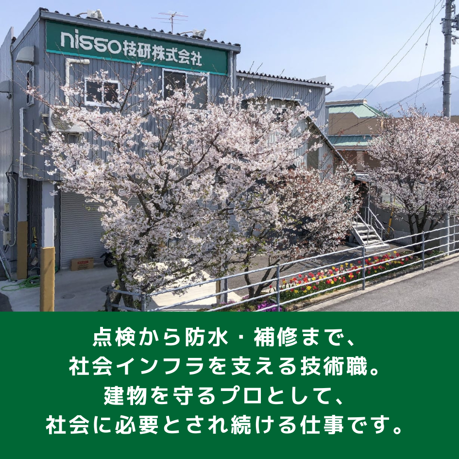 ニッソー技研は、学校や病院、橋など、社会に欠かせないインフラを守る仕事をしています。