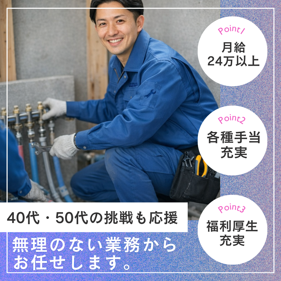 ・年齢59歳迄(定年の為) ・要普通自動車免許(AT限定可) □ 経験者の方へ(当社の考え方) ※まず、怒鳴る・放置する・丸投げは、一切ありません。 ▼「経験者だから即フル任せ」ではありません。 これまでのやり方や経験を尊重しながら、 まずは当社の現場の流れを知ってもらうところから。 ・現場ルールや作業手順の共有 ・先輩と一緒に作業しながらすり合わせ ・得意分野・経験内容を把握した上で役割を決定 「とりあえず一人でやって」は言いません。 ▼最初は“確認しながら”でOK 入社後すぐに難しい判断や段取りを任せることはありません。 ・現場全体の流れを把握 ・設備内容・施工方法の確認 ・先輩と並んでの作業 「分かる → 確認する → 任せる」この順番を大切にしています。 ▼現場は必ず複数人 一人親方のような働き方はさせません。 困ったときはすぐ聞ける環境です。 「経験者だけど聞きにくい…」 そんな雰囲気はありません。 ▼失敗を責める会社ではありません やり方の違い、判断ミスは誰にでもあります。 声を荒げることはなく 「次はこうしよう」と一緒に改善します。 ▼キャリアは“止まりません” 経験を積んだその先も用意しています。 ・配管工として技術をさらに磨く ・資格取得 ・施工管理として現場をまとめる 「ずっと現場だけ」も 「管理に挑戦」も選べます。 【こんな方に向いています】 ・配管工事の経験が2年以上ある方 ・落ち着いた現場で長く働きたい ・怒鳴られる職場から離れたい ・技術をちゃんと評価されたい ◎1つでも当てはまれば、歓迎 |